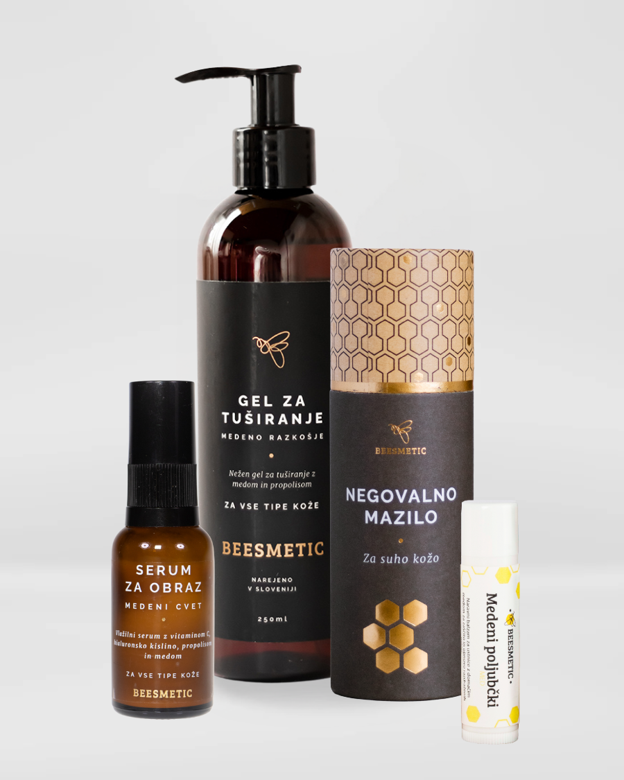 SESTAVINE: voda, glicerin, jojobino olje, skvalan, izoamil lavrat, med, sklerotijeva guma, askorbil palmitat (derivat vitamina C), tokoferil acetat (derivat vitamina E), kaprilni/kaprinski trigliceridi, saharoza lavrat, gliceril kaprilat, natrijev benzoat, kalijev sorbat, tokoferol (vitamin E), natrijev hialuronat (hialuronska kislina), citronska kislina, ekstrakt listov Manilkara Multinervis, maltodekstrin, polisaharidi semena aleksandrijske sene, propolis ekstrakt, parfum*, fenoksietanol, citronelol**, geraniol**, linalol**, citral**.